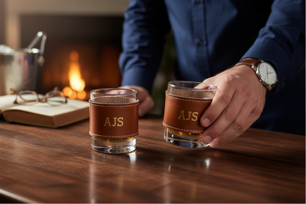 Glasses come with customizable sleeves hand-crafted from 3/4 oz. bridle leather